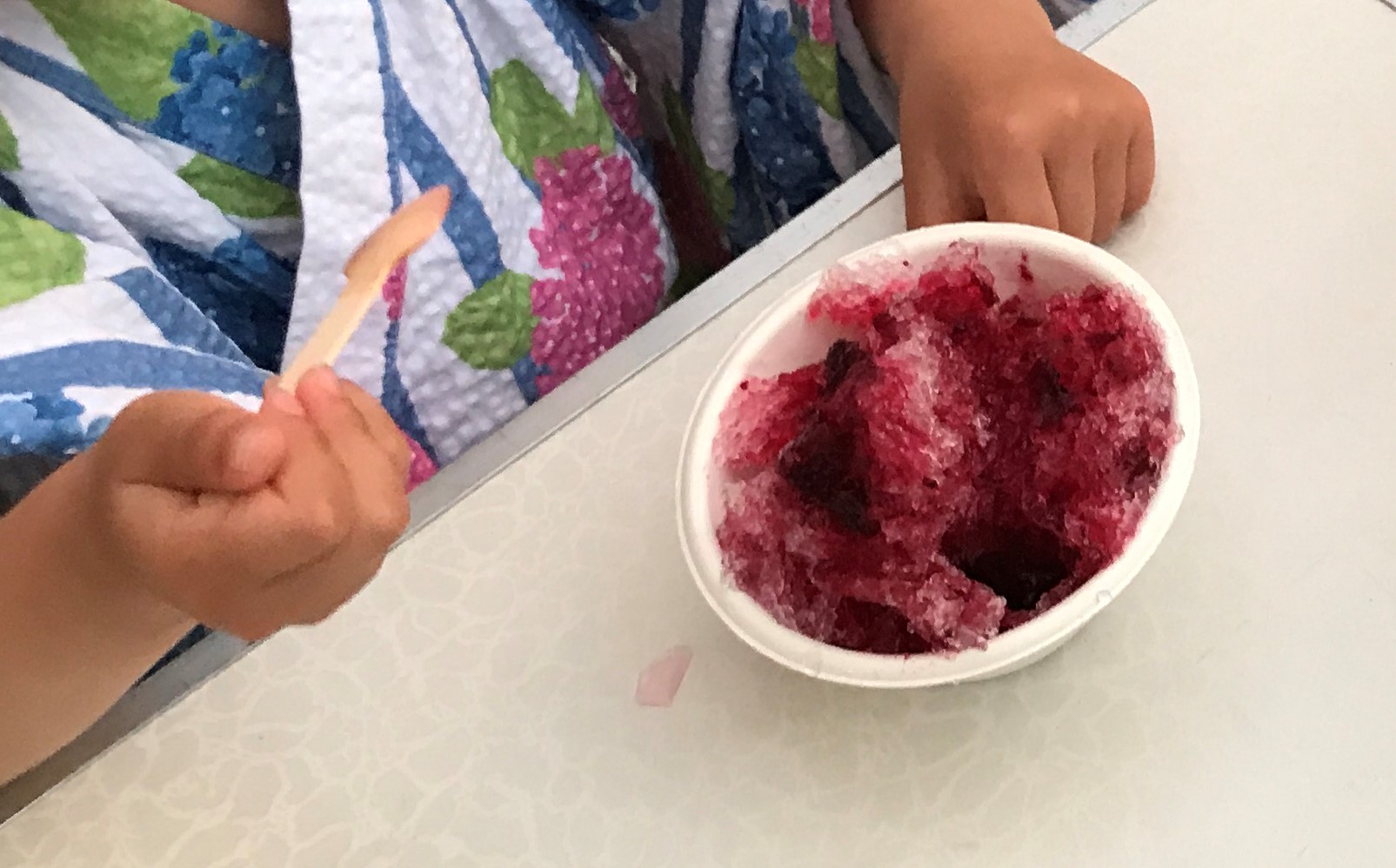 後で聞いてみると、普通のかき氷のような、子ども受けする毒々しいほど鮮やかで甘い氷みつではなかったので、あまりおいしく感じなかったようです。